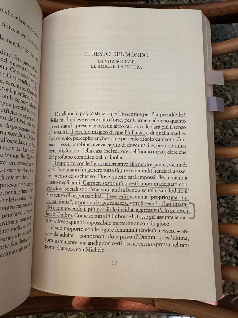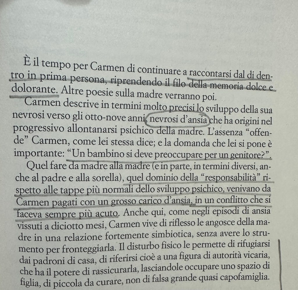 Carmen aveva quattro anni quando sua madre si ammala di psicosi paranoide e gli tocca fare la grande, la iper-responsabile, perché lo spazio del gioco e del desiderio è già occupato dalla madre.